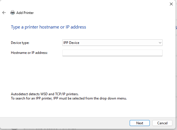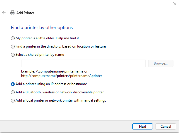 5. Select the option "Add a printer using an IP address or hostname" and then click next