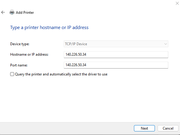 6. In Hostname or IP address text box, type in the IP address for the Zebra Printer that one needs to connect to.