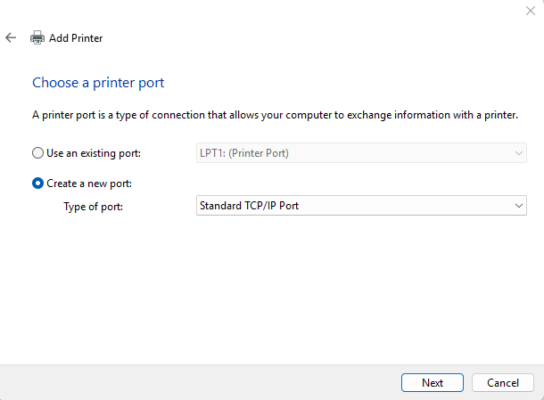 5. Choose “Create a new port” and then in the drop down of “Type of port”, choose “Standard TCP/IP Port”. Then click “Next button